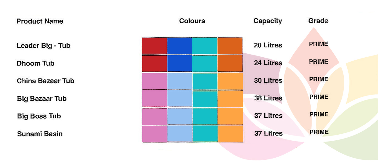 Convenient, sturdy and multi - utility tubs. Makes your work easy and quick. Helps you keep things where they belong. Available in various shapes, sizes and capacity.